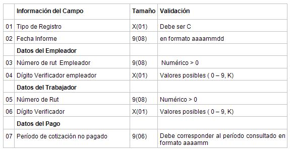 Libro II Cotizaciones Previsionales > Título XII Subsidio al empleo de la Ley N° 20.338. Instrucciones a las Administradoras de Fondos de Pensiones y al Instituto de Previsión Social respecto de la información a entregar sobre el pago de cotizaciones > Anexos > Anexo Nº 4 Archivo de consulta "Pagos suspendidos"