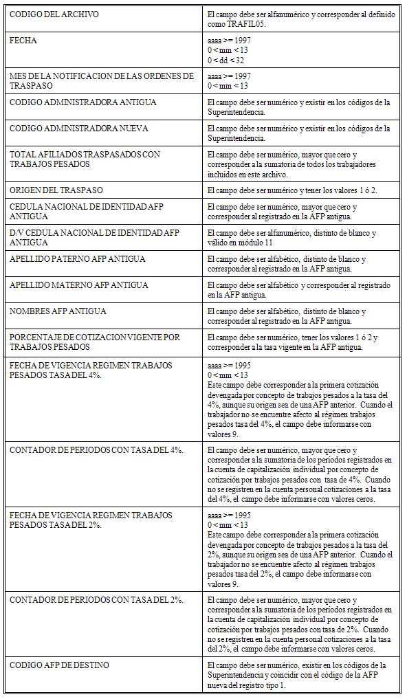 - Registro tipo 2: Detalle de la situación previsional de afiliados con trabajos pesados. Esta información corresponde al período de afiliación del trabajador en la administradora antigua y se incluirá un registro por cada afiliado traspasado.