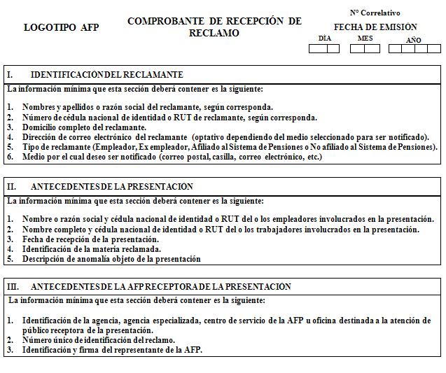 Libro I Afiliación al Sistema de Pensiones del D.L. N° 3.500 de 1980 > Título VII Reclamos: Anomalías en Afiliación, Cuentas Personales, Cotizaciones y Traspasos > A. Procedimientos para el Proceso de Gestión de Reclamos > Anexos > Anexo Nº 1 Comprobante de Recepción de Reclamo