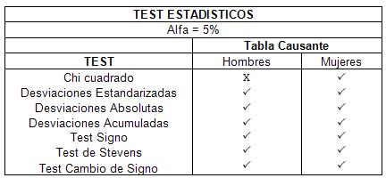 Como podemos ver, la tabla de hombres pasa todos los test menos el de Chi cuadrado. Mientras que en el ajuste de las mujeres pasa los 7 tests.