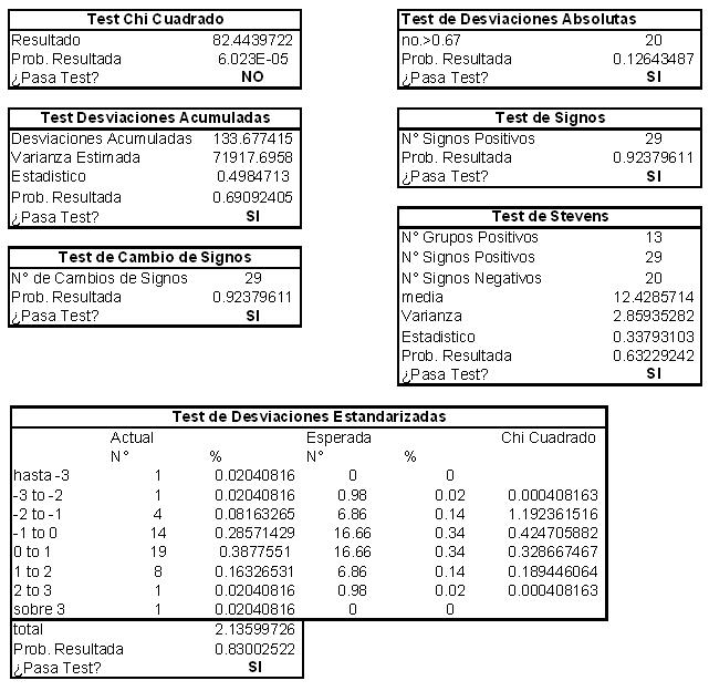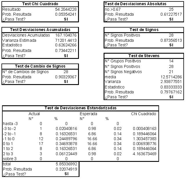 Los fallecimientos en las distintas edades deben ser independientes, y se deben representar en una variable aleatoria normal. Por esta razón las desviaciones Standard deben ser relativamente homogéneas durante todos los tramos. La hipótesis nula a testear es que las desviaciones acumuladas no deben ser mayores al doble de la raíz cuadrada de la varianza de la distribución.