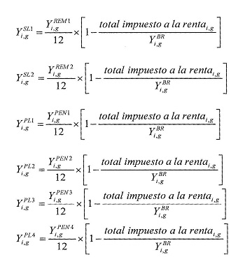 Luego la desagregación de los distintos componentes del ingreso líquido total (Yi,gSL e Yi,gPL), llevados a promedio mensual, se determinan con las siguientes fórmulas: