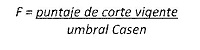 F : Factor de transformación monótona del instrumento para dejarlo en términos de puntaje. El valor F corresponde al cuociente entre el puntaje de corte vigente para tener acceso a los beneficios del Sistema de Pensiones Solidarias y el valor del umbral Casen proporcionado en forma conjunta por el Ministerio del Trabajo y Previsión Social y el Ministerio de Hacienda; y se determina de la siguiente manera: