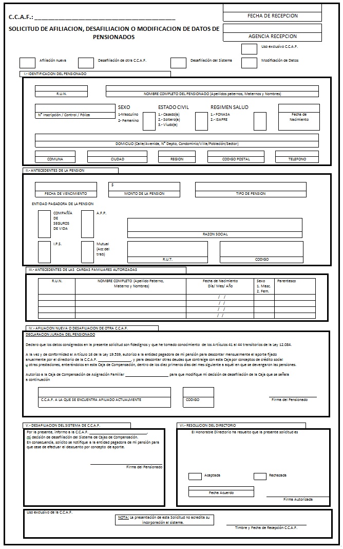 En este Casillero el pensionado afiliado informa a la C.C.A.F. en que se encuentre afiliado su decisión de desafiliarse del Sistema de Compensación de Asignación Familiar y solicita que se informe este hecho a la entidad pagadora de su pensión. El pensionado deberá estampar su firma para formalizar su desafiliación.