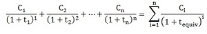 c) A la fecha de formalización del contrato de crédito sindicado, se determinará el spread de mercado asociado a dicho contrato, el cual será igual a la diferencia entre la tasa del crédito y la tasa libre de riesgo equivalente (tequiv). Esta última se calculará a partir de la siguiente fórmula, siendo las tasas t1,t2,…,tn aquellas tasas libres de riesgo correspondientes a cada uno de los plazos de cada cuota del crédito sindicado: