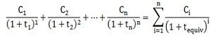 c) A la fecha de perfeccionamiento de una operación de leasing, se determinará el spread de mercado asociado a dicho contrato, el cual será equivalente a la diferencia entre la tasa de interés establecida en el contrato y la tasa libre de riesgo equivalente (tequiv). Esta última a su vez, se calculará a partir de la siguiente fórmula, siendo las tasas t1,t2,…,tn aquellas tasas libres de riesgo correspondientes a cada uno de los plazos de cada cuota de la operación de leasing.