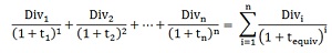 c) A la fecha de perfeccionamiento de la inversión en un contrato de mutuo hipotecario, se determinará el spread de mercado asociado a dicho contrato, el cual será igual a la diferencia entre la tasa de endoso y la tasa libre de riesgo equivalente (tequiv). Esta última se calculará a partir de la siguiente fórmula, siendo las tasas t1,t2,…,tn aquellas tasas libres de riesgo correspondientes a cada uno de los plazos de cada dividendo del mutuo hipotecario: