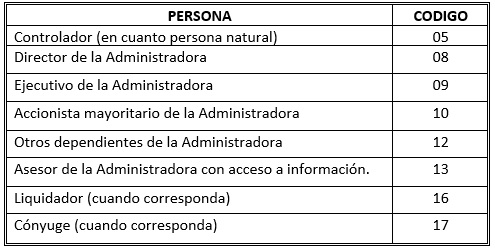 iii. "Relación o Posición": Este ítem tiene por objeto especificar la relación o posición que ocupa la persona natural o jurídica respecto de la Administradora de Fondos de Pensiones o de la administradora de cartera de recursos previsionales. Para ello, se deberá completar la columna utilizando los códigos numéricos de dos dígitos especificados en la siguiente tabla: