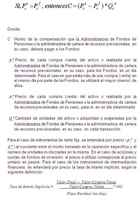 El monto que las Administradoras de Fondos de Pensiones o las administradoras de cartera de recursos previsionales deberán entregar a los Fondos por concepto de diferencias obtenidas en operaciones ventajosas para ésta, se denominará "compensación". Para efectos de su cálculo se utilizará el concepto de "mismo activo" definido para las prohibiciones de las letras e) y f) anteriores, y la siguiente metodología: