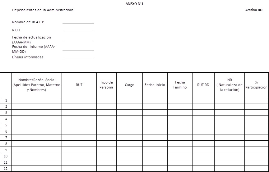 Libro IV Fondos de Pensiones y Regulación de Conflictos de Intereses > Título X Conflictos de Intereses > B.Regulación de la Sección II.4 del Régimen de Inversión de los Fondos de Pensiones > Anexos > Anexo N° 1 Archivo RD