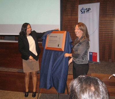 La Superintendenta de Pensiones, Solange Berstein, y la Directora regional metrolitana de Senda, Johanna Olivares, descubriendo una placa que señala que éste es el primer servicio público certificado como espacio laboral libre de alcohol y drogas.