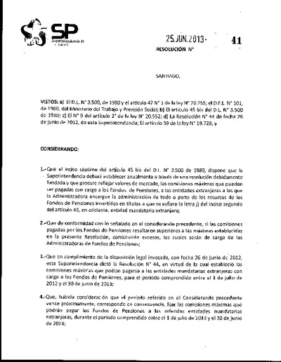 Resolución N°41, 25 de junio de 2013, comisiones máximas, Fondos de Pensiones, mandatarias extranjeras.