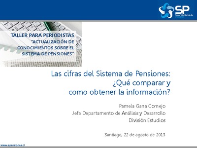 Presentación de la jefa del Departamento de Análisis y Desarrollo de la División de Estudios, Pamela Gana, en el Taller para Periodistas "Actualización de conocimientos sobre el Sistema de Pensiones", realizado en Santiago el 22 y 29 de agosto de 2013.