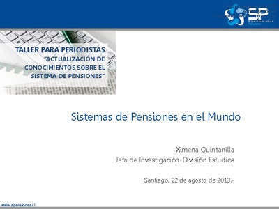 Presentación de la jefa de Investigación de la División de Estudios, Ximena Quintanilla, en el Taller para Periodistas "Actualización de conocimientos sobre el Sistema de Pensiones", realizado en Santiago el 22 y 29 de agosto de 2013.