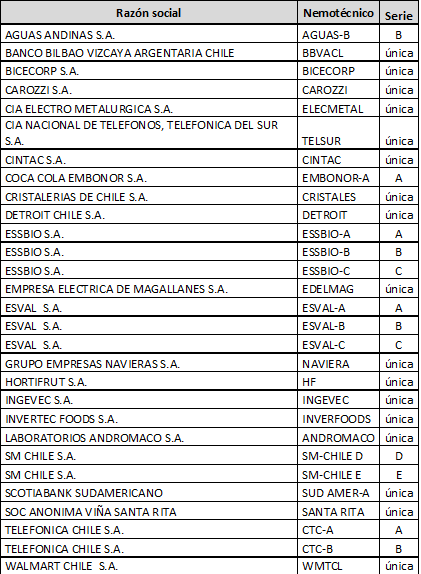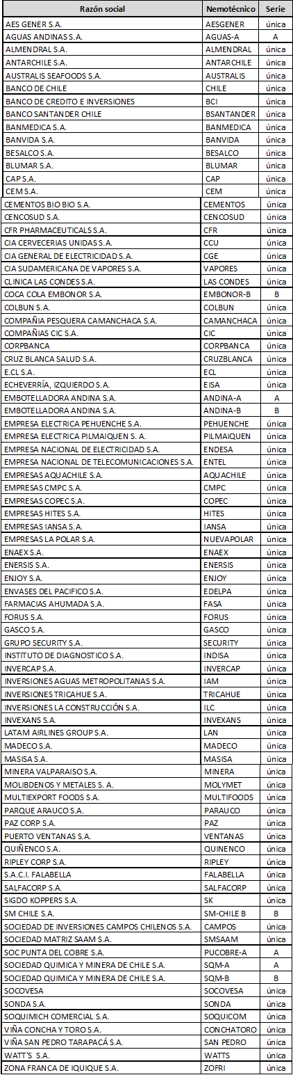 1. De acuerdo a lo dispuesto en el inciso sexto del artículo 45 del D.L 3.500 de 1980 y en el Régimen de Inversión de los Fondos de Pensiones las acciones elegibles en categoría general, tanto por instrumento como por emisor, a partir del 13 de junio de 2014, en virtud del cumplimiento del requisito de presencia ajustada mayor o igual a 25% o contar con un market maker en los términos y condiciones establecidos en la normativa vigente, son las siguientes: