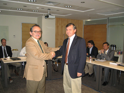 | El Superintendente de Pensiones, Alvaro Gallegos Alfonso, saluda al presidente del CTI, Joaquín Echeñique Rivera. |