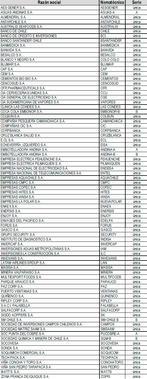 De acuerdo a lo dispuesto en el inciso sexto del artículo 45 del D.L 3.500 de 1980 y en el Régimen de Inversión de los Fondos de Pensiones, las acciones elegibles en Categoría General, tanto por instrumento como por emisor, a partir del 26 de enero de 2015, en virtud del cumplimiento del requisito de presencia ajustada mayor o igual a 25% o porque cuentan con un market maker en los términos y condiciones establecidos en la normativa vigente, son las siguientes: