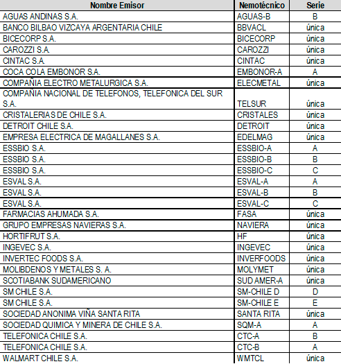 Las acciones elegibles en Categoría General por Emisor, a partir del 26 de enero de 2015, en virtud de que poseen dos clasificaciones de riesgo en primera clase y no tienen presencia ajustada mayor o igual a 25%, o que cuentan con un market maker en los términos y condiciones establecidos en la normativa vigente, son las siguientes: