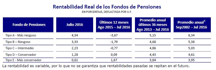 Al 31 de julio de 2016, el valor de los Fondos de Pensiones alcanzó los $113.947.518 millones (US$ 171.365 millones), lo que equivale a una variación real de 0,8% (5,1% nominal) en doce meses.