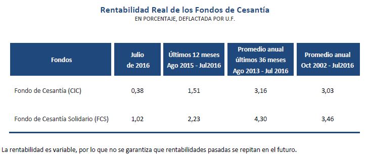 Los Fondos de Cesantía también obtuvieron rentabilidades positivas durante el mes de julio: el Fondo de Cesantía (CIC) anotó un alza de 0,38%, mientras el Fondo de Cesantía Solidario (FCS) avanzó 1,02%. En ambos casos, el rendimiento se explica por el retorno positivo de las inversiones en renta fija nacional.