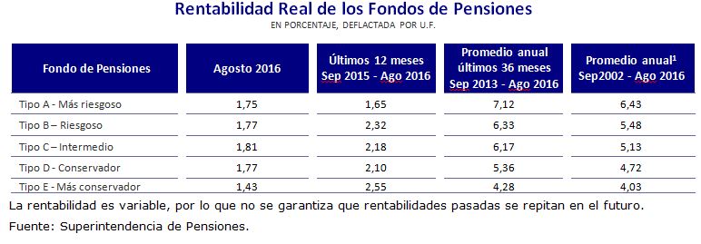 Por segundo mes consecutivo, todos los Fondos de Pensiones y de Cesantía registraron rentabilidades positivas, según el informe que elabora mensualmente la Superintendencia de Pensiones. Durante agosto, el mayor avance lo registró el Fondo C (Intermedio) -que invierte hasta un 40% en renta variable-, con una rentabilidad real mensual de 1,81%.