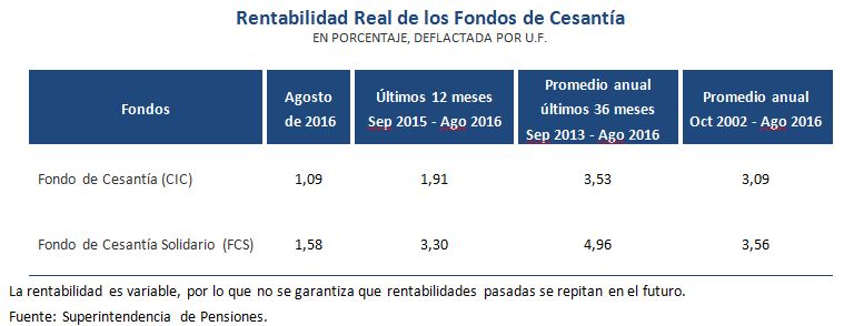Al igual que los Fondos de Pensiones, los Fondos de Cesantía terminaron agosto con avances: mientras el Fondo de Cesantía (CIC) anotó un alza de 1,09%, el Fondo de Cesantía Solidario (FCS) avanzó 1,58%. En ambos casos, el rendimiento se explica por el retorno positivo de las inversiones en renta fija nacional e internacional.