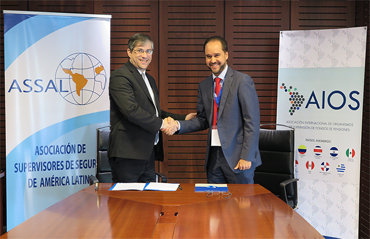Santiago, 26 de octubre de 2016.- La Asociación Internacional de Organismos de Supervisión de Fondos de Pensiones (AIOS) y la Asociación de Supervisores de Seguros de América Latina (ASSAL), firmaron un Convenio de Cooperación que tiene entre sus objetivos fortalecer las capacidades de regulación y supervisión en las áreas atingentes a cada organización.