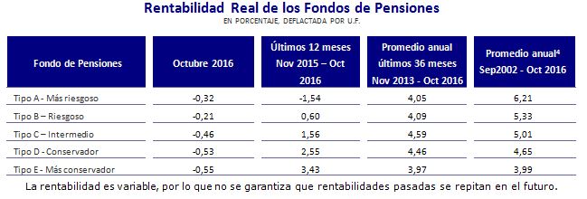 Los cinco Fondos de Pensiones anotaron rentabilidades negativas durante octubre de 2016, según el informe que elabora mensualmente la Superintendencia de Pensiones. El Fondo A (Más Riesgoso) tuvo un -0,32%; el Fondo B (Riesgoso), un -0,21%; el Fondo C (Intermedio), un -0,46%; el Fondo D (Conservador), un -0,53% y el Fondo E (Más Conservador) un -0,55%.