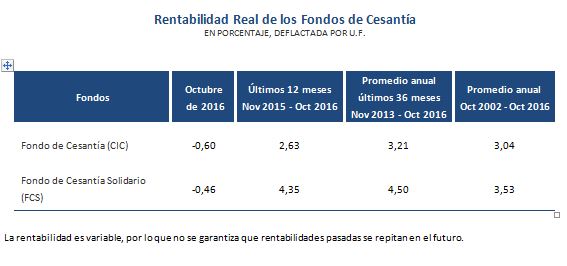 Al cierre de octubre de 2016, el valor de los activos del Fondo de Cesantía (CIC) registra un saldo de $4.273.714 millones (US$ 6.558 millones), lo que significa un aumento de 13% respecto al mismo mes del año anterior (9% real). Por su parte, el valor del Fondo de Cesantía Solidario (FCS) al cierre de octubre es de $2.030.700 millones (US$ 3.116 millones), un alza de 17% (13% real) en relación a igual mes de 2015.