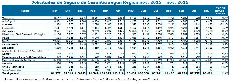 La Superintendencia de Pensiones (SP) publicó el Informe Mensual del Seguro de Cesantía, con cifras a noviembre de 2016. Durante dicho mes se totalizaron 90.451 nuevas solicitudes aprobadas del beneficio, una baja de 1,4% respecto a igual mes del año anterior y un aumento de 3,5% en relación a octubre de 2016 (ver gráfico).