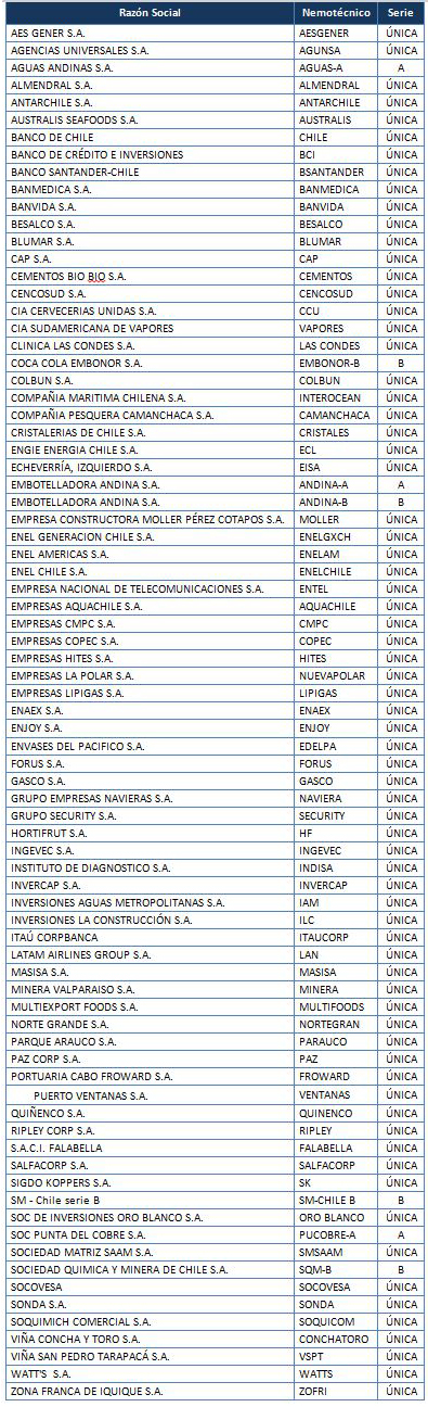 1. De acuerdo a lo dispuesto en el inciso sexto del artículo 45 del D.L. 3.500 de 1980 y en el Régimen de Inversión de los Fondos de Pensiones, las acciones elegibles en categoría general, tanto por instrumento como por emisor, a partir del 3 de febrero de 2017, en virtud del cumplimiento del requisito de presencia ajustada mayor o igual a 25% o contar con un market marker en los términos y condiciones establecidos en la normativa vigente, son las siguientes: