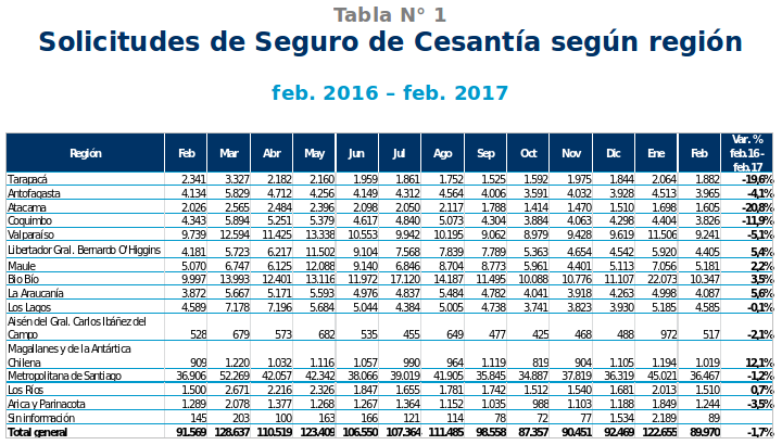 La Superintendencia de Pensiones (SP) publicó el Informe Mensual del Seguro de Cesantía, con cifras a febrero de 2017. Durante dicho mes se totalizaron 89.970 nuevas solicitudes aprobadas del beneficio, que representó disminuciones de 1,7% respecto a igual mes del año anterior y de 26,6% en relación a enero de 2017.