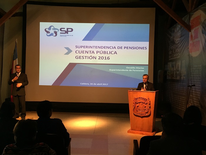En el Centro Cultural Estación de la comuna de Caldera, Región de Atacama, el Superintendente de Pensiones, Osvaldo Macías, entregó la Cuenta Pública Participativa de la institución correspondiente a la gestión del año 2016. A la actividad asistieron la Subsecretaria de Previsión Social, Jeannette Jara; la Seremi del Trabajo y Previsión Social de Atacama, Dissa Castellani; autoridades nacionales, regionales y comunales, y representantes de juntas de vecinos y organizaciones sociales, comunitarias, sindicales y culturales de la comuna.