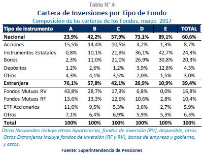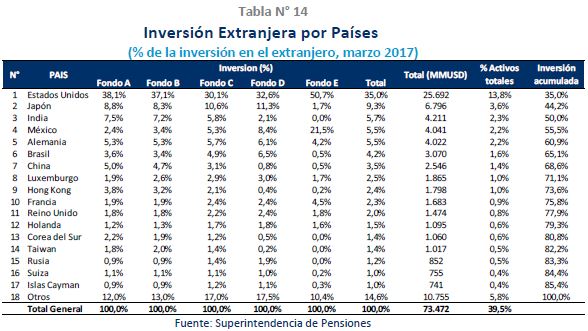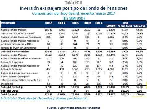 La cartera de los Fondos de Pensiones en el extranjero alcanzó los US$ 73.477 millones a marzo de 2017, correspondiente a un 39,4% del total de activos. La renta variable se mantuvo como el principal componente de la cartera de inversiones en el exterior, con una participación de 63,3% del total de activos en el exterior.