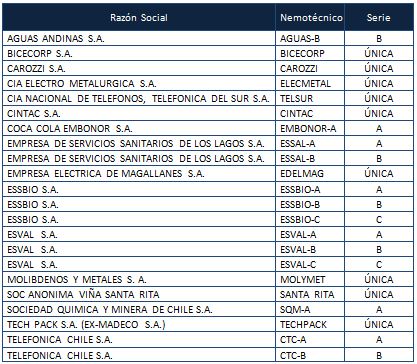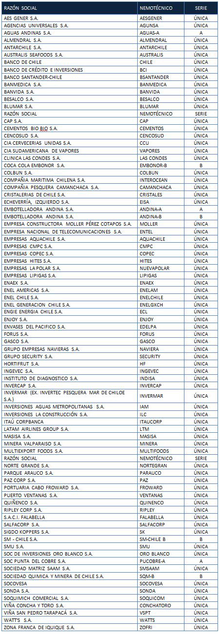 1. De acuerdo a lo dispuesto en el inciso sexto del artículo 45 del D.L. 3.500 de 1980 y en el Régimen de Inversión de los Fondos de Pensiones, las acciones elegibles en categoría general, tanto por instrumento como por emisor, a partir del 4 de agosto de 2017, en virtud del cumplimiento del requisito de presencia ajustada mayor o igual a 25% o contar con un market maker en los términos y condiciones establecidos en la normativa vigente, son las siguientes: