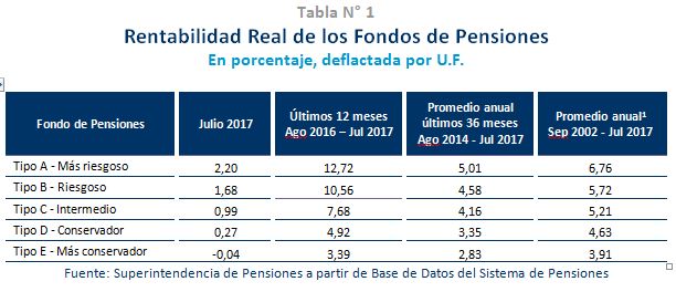 Al 31 de julio de 2017, el valor de los Fondos de Pensiones alcanzó los US$ 195.298 millones ($127.252.558 millones), cifra 9,8% real mayor que igual fecha del año pasado. Del total, 59,1% se encuentra invertido en el mercado nacional y el 40,9% en el extranjero. Mientras que por tipo de activos, el 62,1% de los fondos está en renta fija, el 37,7% en renta variable y el 0,2% en otros activos.