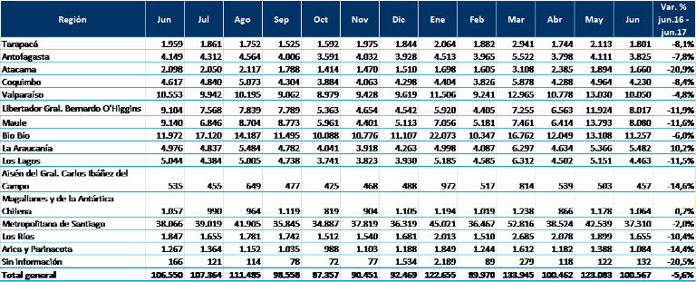 Respecto a la información regional, en el período junio 2016 - junio 2017 se registraron las principales bajas en Atacama, Aisén y Arica y Parinacota. Mientras que se vieron alzas solamente en las regiones de La Araucanía y Magallanes (ver Tabla N° 1).