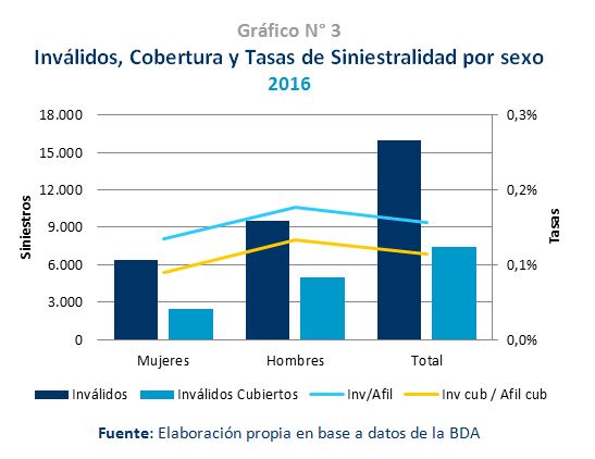 Durante el año 2016, cerca de 16.000 afiliados al sistema se pensionaron por invalidez y alrededor de 14.500 afiliados no pensionados fallecieron. La tasa de siniestralidad del sistema fue de 1,43 fallecimientos por cada mil afiliados no pensionados y de 1,57 inválidos por cada mil afiliados. Las tasas de siniestralidad, tanto de fallecimiento como de invalidez, son crecientes con la edad. Además, estas tasas son mayores para hombres que mujeres, tal como se observa en los siguientes gráficos: