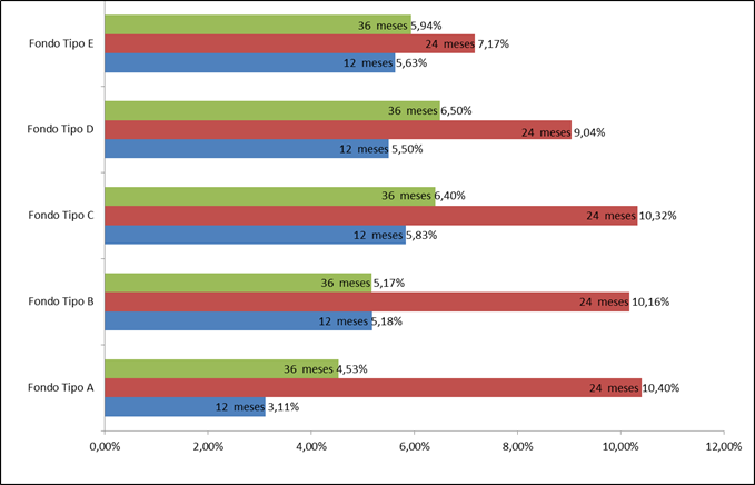 De cerca al fondo A le siguió el B (riesgoso), con una rentabilidad real de 4,88%. Poco más atrás se situó el fondo C (intermedio), con un avance real de 3,59%. Por último, se ubicaron los fondos D (conservador) y E (más conservador), con rentabilidades reales de 2,53% y 1,69%, respectivamente.
