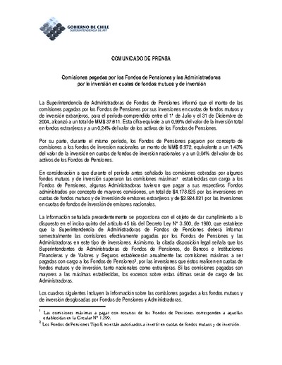 Comisiones pagadas por los Fondos de Pensiones entre el 1° de Julio y el 31 de Diciembre de 2004