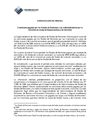 Comisiones pagadas por los Fondos de Pensiones entre el 1 de Enero y el 30 de Junio de 2004