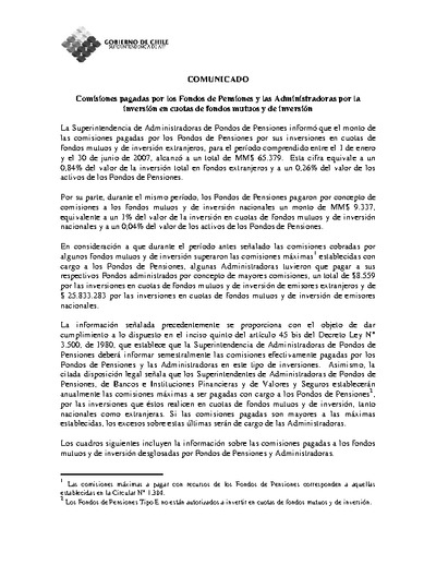 La Superintendencia de Administradoras de Fondos de Pensiones informó que el monto de las comisiones pagadas por los Fondos de Pensiones por sus inversiones en cuotas de fondos mutuos y de inversión extranjeros, para el período comprendido entre el 1 de enero y el 30 de junio de 2007, alcanzó a un total de MM$ 65.379. Esta cifra equivale a un 0,84% del valor de la inversión total en fondos extranjeros y a un 0,26% del valor de los activos de los Fondos de Pensiones.