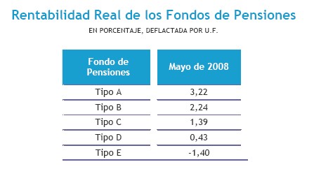 Retornos positivos obtuvieron durante mayo de 2008 los Fondos de Pensiones tipo A, B, C y D, situación explicada principalmente por la rentabilidad de las inversiones en instrumentos de renta variable nacionales y extranjeros. El Fondo E, en tanto, tuvo un retroceso.