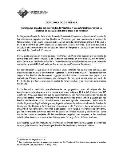 La Superintendencia de Administradoras de Fondos de Pensiones informó que el monto de las comisiones pagadas por los Fondos de Pensiones por sus inversiones en cuotas de fondos mutuos y de inversión extranjeros, para el período comprendido entre el 1 de julio y el 31 de diciembre de 2007, alcanzó a un total de $ 75.564 millones. Esta cifra equivale a un 0,85% del valor de la inversión total en fondos extranjeros y a un 0,28% del valor de los activos de los Fondos de Pensiones.