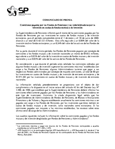 La Superintendencia de Pensiones informó que el monto de las comisiones pagadas por los Fondos de Pensiones por sus inversiones en cuotas de fondos mutuos y de inversión extranjeros, para el período comprendido entre el 1 de enero y el 30 de junio de 2008, alcanzó a un total de $ 65.123 millones. Esta cifra equivale a un 0,80% del valor de la inversión total en fondos extranjeros y a un 0,24% del valor de los activos de los Fondos de Pensiones.