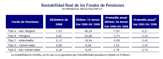 Medidas apuntan principalmente a mejorar el nivel de información de los afiliados respecto del riesgo a que se exponen al optar por un fondo. La Superintendencia también informó de los resultados de rentabilidad de los fondos de pensiones a diciembre de 2008. Pese a que todos los multifondos tuvieron retornos positivos en el último mes del año, el resultado en 12 meses fue negativo para todos ellos.