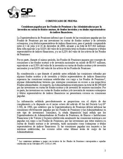 La Superintendencia de Pensiones informó que el monto de las comisiones pagadas por los Fondos de Pensiones por sus inversiones en cuotas de fondos mutuos y de inversión extranjeros, y en títulos representativos de índices financieros, para el período comprendido entre el 1 de julio y el 31 de diciembre de 2008, alcanzó a un total de $57.416 millones. Esta cifra equivale a un 0,82% del valor de la inversión total en fondos extranjeros y títulos representativos de índices financieros, y a un 0,23% del valor de los activos de los Fondos de Pensiones.
