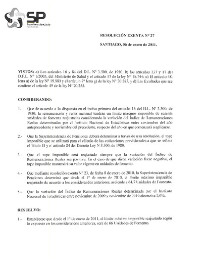 Resolución N° 27, 2011, Tope imponible, cotizaciones obligatorias, AFP, salud, ley de accidentes del trabajo