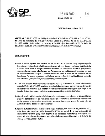 Resolución N°44, 2012, comisiones máximas, Fondos de Pensiones, mandatarias extranjeras